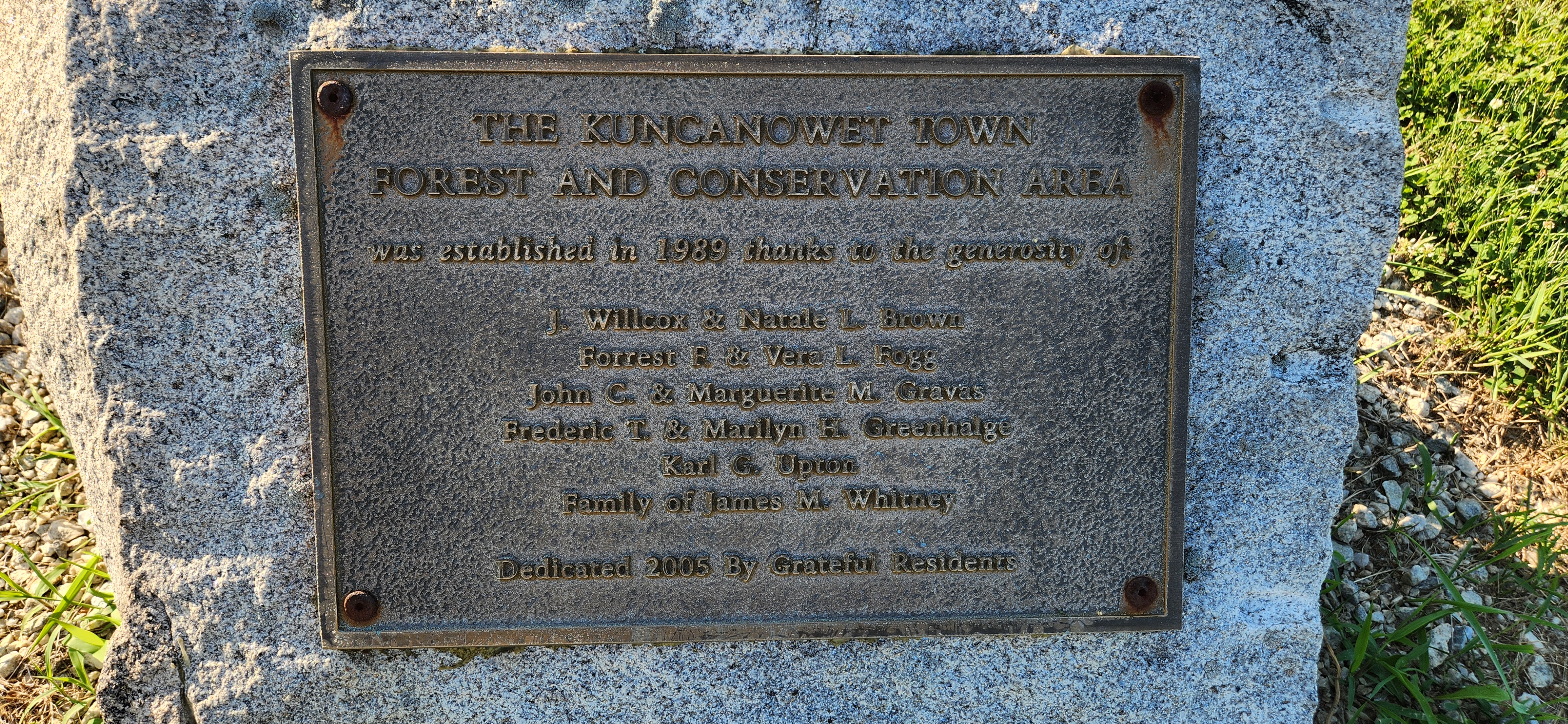 Kuncanowet Town Forest and Conservation Area. The roadside plaque commemmorates its creation in 1989.